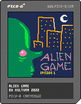 Alien Game: Episode 1 is a complete PICO-8 pixel art adventure released in 2022. Follow Ale the alien as they explore New Sock City, collect items, talk to cats, and battle slime.